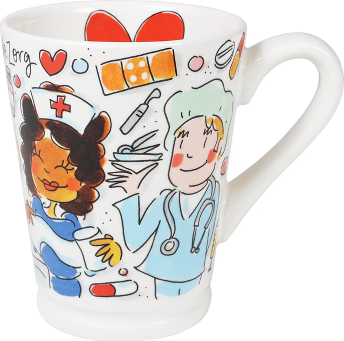 Dag en nacht staan ze voor ons klaar: de medewerkers in de zorg! Dit verdient een unieke mok. Speciaal voor al die lieve mensen met dat grote hart hebben we deze mok ontworpen. Op de XL beker staan verschillende tekeningen die met de zorg te maken hebben en de tekst Hart voor de Zorg