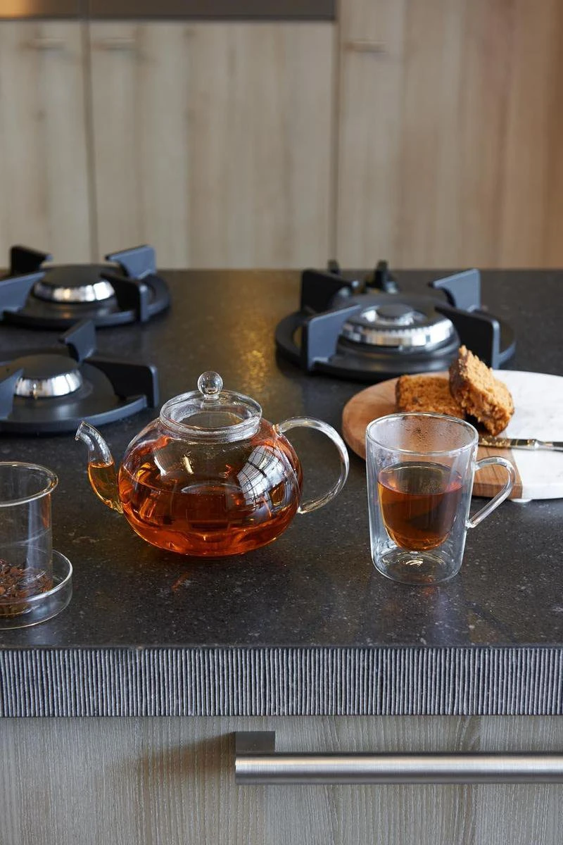 De glazen theepotten zijn vervaardigd uit borosilicaatglas. Dit is hittebestendig glas dat een langere levensduur heeft dan de meeste andere glassoorten. Het materiaal zet minder uit bij verwarming en krimpt minder bij afkoeling dan gewoon glas. Daardoor zal het glas niet snel knappen.