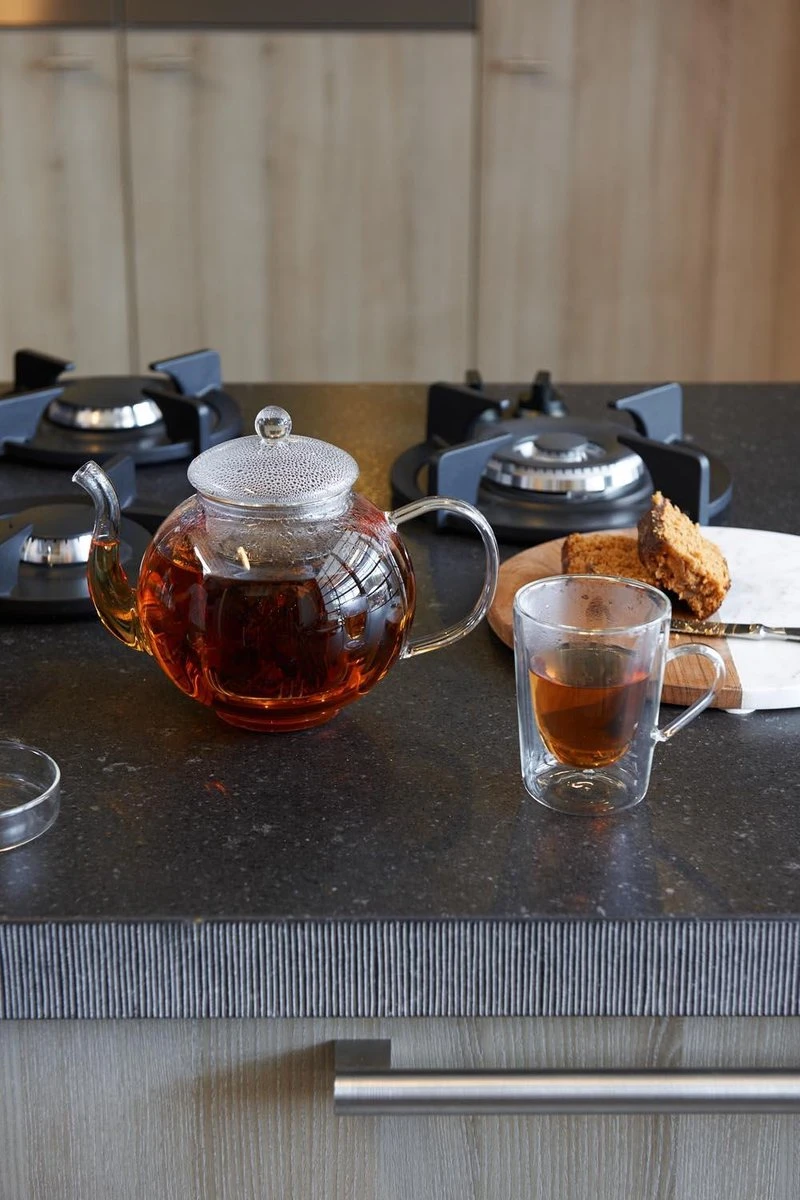 De glazen theepotten zijn vervaardigd uit borosilicaatglas. Dit is hittebestendig glas dat een langere levensduur heeft dan de meeste andere glassoorten. Het materiaal zet minder uit bij verwarming en krimpt minder bij afkoeling dan gewoon glas. Daardoor zal het glas niet snel knappen.